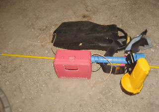 マスクとフィンは当然だが、大きなライト2本、貝殻用に改良されたプラスティックのボックス。貝殻を挟んで採るための「ヤス」まで用意している。