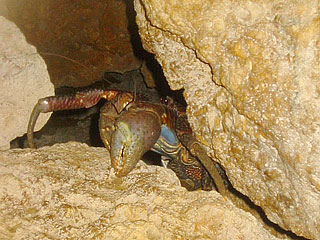 ヤシガニじゃありませんか!夕食の食卓に並ぶヤシガニが頭をよぎる。しかしライト無しじゃうかつに手を出せない。そうこうしてる内に岩陰へ逃げられてしました。悔しー!夕食が‥。仕方なく本来の目的地 ”地底湖”へ。